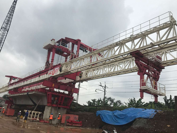 通聯(lián)600t節(jié)段拼裝接橋機(jī)在印尼雅加達(dá)工地順利完成第一片梁的拼裝。